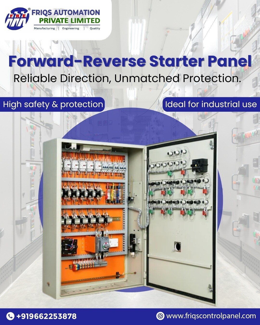 When it comes to industrial motor control, Friqs Automation is a trusted name delivering accuracy, safety, and reliability. Our Forward/Reverse Starter Panel is engineered to provide smooth directional control for motors, ensuring effortless switching between forward and reverse operations while maintaining maximum safety.